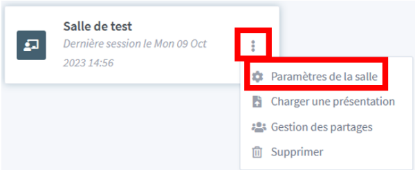 Une fois connecté sur https://webconf.univ-rouen.fr/, cliquez sur les trois petits points verticaux à droite du bloc, puis sur « Paramètres de la salle »