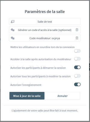- Si activé, toute personne se connectant à la salle aura les droits de modération.