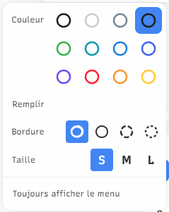 Utiliser le tableau blanc BBBProcédure : Utiliser le tableau blanc de BBB⚓PrérequisPlacez-vous sur la deuxième diapositive du document en utilisant les flèches en bas à droite pour obtenir un fond blanc.Remarque : Vous pouvez aussi charger un PDF vide en document de présentation pour obtenir un fond blanc.ProcédureAccès aux styles / Annuler ou Rétablir la dernière actionPositionnement des formesBoutons d'actions sur le tableau blancSupprimerPasser en mode multi-utilisateursAjuster le niveau de zoomAjuster la largeurAccès aux styles / Annuler ou Rétablir la dernière action⚓Panneau des styles⚓Positionnement des formes⚓Panneau des positions⚓Boutons d'actions sur le tableau blanc⚓Dans l'ordre :⚓SélectionPanoramiqueCrayonGommeFormesFlècheTexteNote (crée un post-it)Supprimer⚓Il faut d'abord qu'une forme soit sélectionnéePasser en mode multi-utilisateurs⚓Ajuster le niveau de zoom⚓Ajuster la largeur⚓