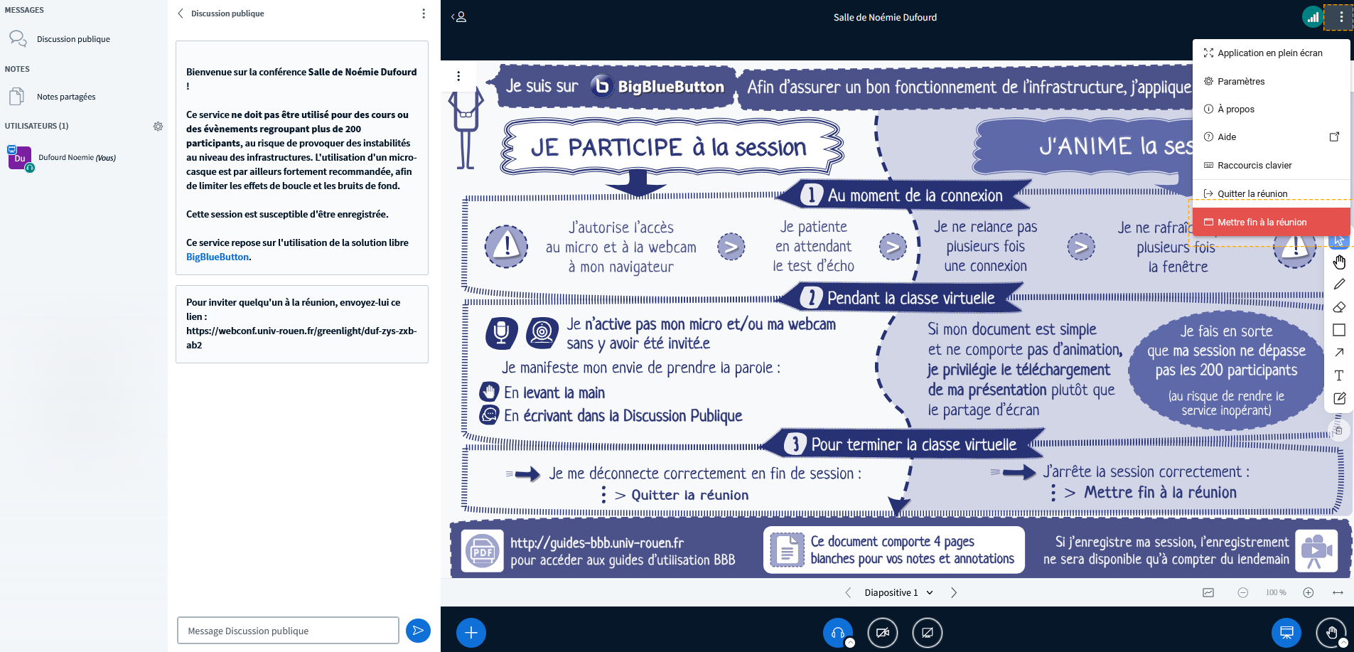 - Cliquez sur les trois points en haut à droite, puis sur la ligne rouge « Mettre fin à la réunion »⚓