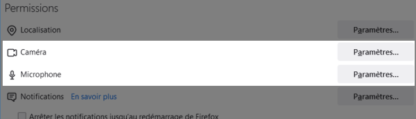 Sur la ligne « Caméra », cliquez sur « Paramètres » et vérifier que la case « Bloquer les nouvelles demandes d'accès à votre caméra » n'est pas cochée.
